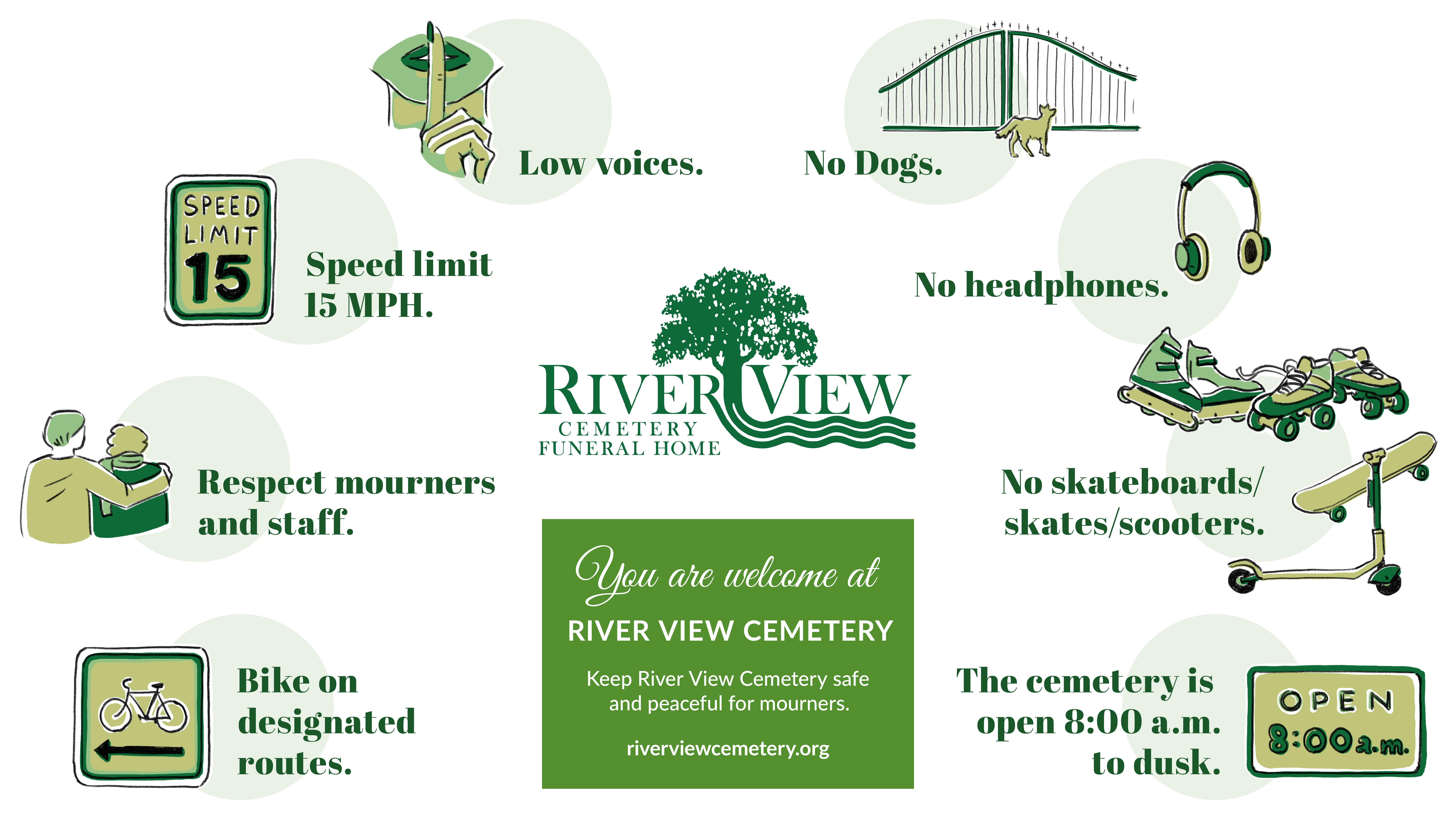 River View Cemetery is private property owned by the non-profit River View Cemetery Association. River View is an operating cemetery, serving nearly 600 client families a year at the time of death, and more than double that for clients wishing to pre-plan. There is onsite heavy equipment usage and approximately 30 employees who routinely navigate the 165-acre site to conduct business. While River View allows the public to bike and walk through our cemetery, it is a privilege, not a right. Please help us in maintaining the Cemetery for its intended use of a peaceful, solemn space by adhering to the following guidelines.
